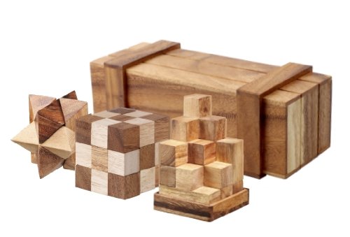 This amazing puzzle experience begins with the receiver opening the box, but don't expect a simple flip of the lid. We've constructed our gift set so that even the box is a puzzle in itself. Once you've figured out the trick, you're ready to move on to the more challenging brainteasers contained within:The Snake Puzzle - Unravel this cube into a snake (just twist and swivel the 27 wooden cubes to uncoil the serpent) then try putting it back together. This legendarily difficult brain-teasing puzzle will have you undulating in no time. Skill and patience will be tried when turning the snake back into the original cube.The Soma Cube: A solid dissection puzzle invented by Piet Hein in 1936 during a lecture on quantum mechanics conducted by Werner Heisenberg. With 240 distinct solutions of the Soma-cube puzzle, it's one you are sure to come back to over and over again. Your mission is to assemble the seven pieces of the puzzle into a 3x3x3 in cube or a variety of other interesting 3D shapes that are given with the instructions.The Star Puzzle: The Star puzzle's story begins a long time ago in a small village in India, where a young farmer somehow learned to fly just before his wedding. With this new ability, he found the perfect gift for his bride to be: he plucked a star from the heavens. Unfortunately he was so nervous about the upcoming nuptial that he let the star fall to the earth and it subsequently broke into six pieces. Reconstruct this ancient fable with this celestially challenging puzzle. Take the star apart and rebuild it using the six interlocking pieces. Read more...