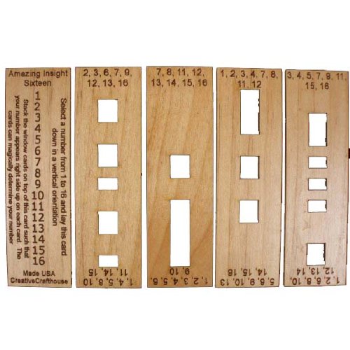 Have someone a number from 1 to 16 and these amazing alder wood cards will quickly determine the number. The secrets of these long lost cards were found in a 1942 book by Maurice Kraitchik called Mathematical Recreations. They are also called window cards and have a fun magical edge to them. Each card is 1.3" x 4" x 1/8" thick alder wood with the numbers and text deeply laser engraved. Read more...